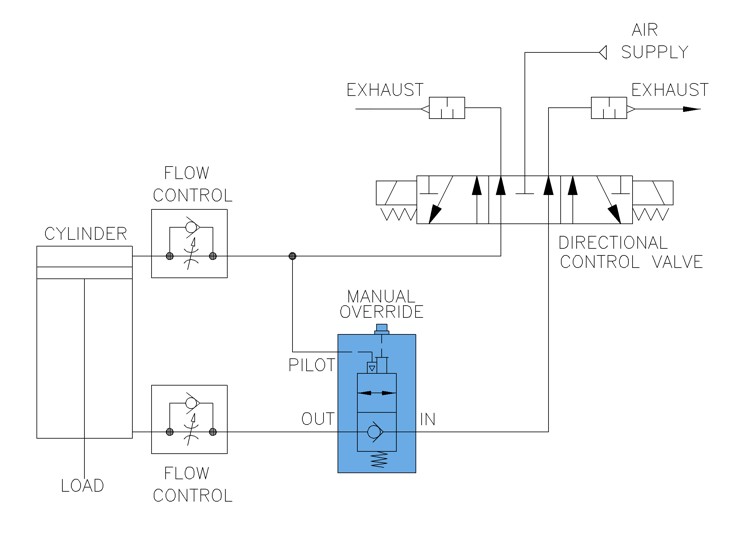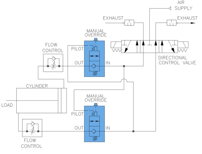 Aladco® highly recommends the use of spring centered 3 position 5-way centered vented valves for directional control with the use of Nu-Check® valves.